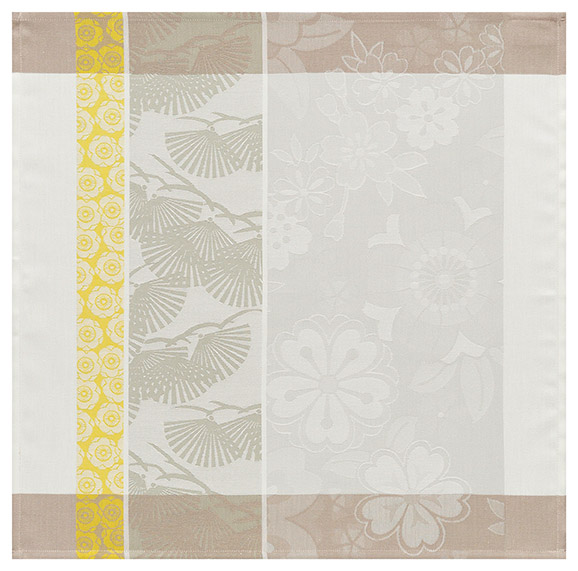 Sakura Inspired by the motifs on Japanese kimonos and paper, this design renews floral motifs in a free-flowing and graphic style outside of a framework. Stripes puncutate the whirlwind of whtie cherryblossoms. You find yourself daydreaming..